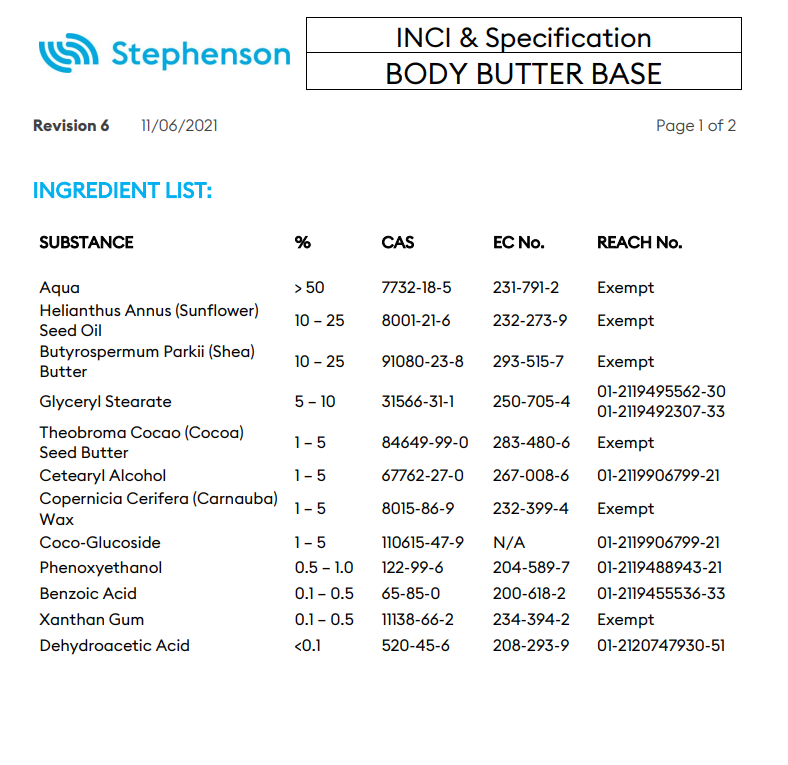 Body butter base by Stephenson is the perfect starting point for creating a wide range of finished premium products. Customize your body butter products by simply adding your combination of colour, fragrance & extracts.
