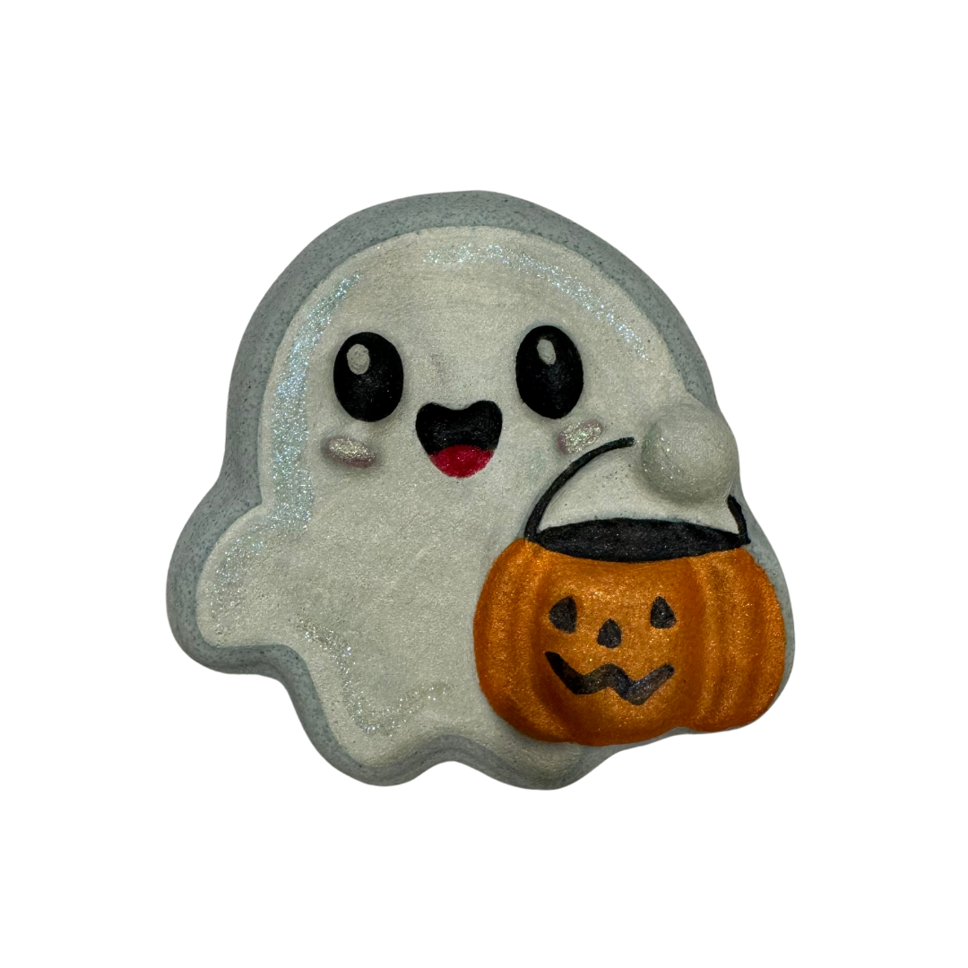 Trick or Treating Ghost Plastic Hand Mold - An adorable ghost with a pumpkin treat bucket!